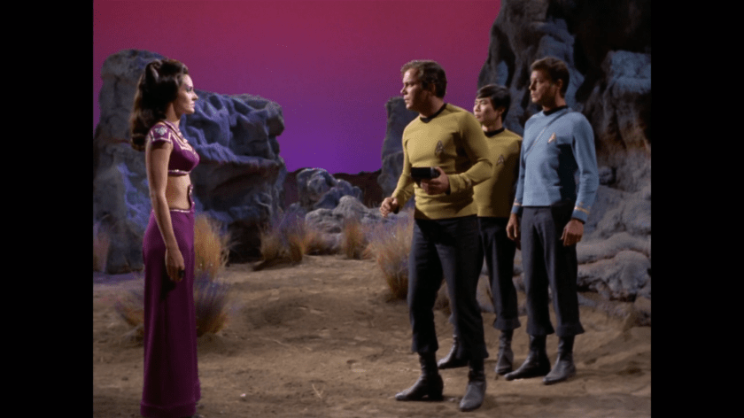 The Enterprise finds a planet that defys explanation. Ergo we venture onto said planet to explore. Kirk takes Sulu, a geologist Lt. D’Amato, and McCoy with his away team. The only one that makes sense is Lt. D’Amato. Sulu perhaps, maybe it was his turn to have field experience. McCoy doesn’t make sense at all considering his specialty is medical science rather the biology.