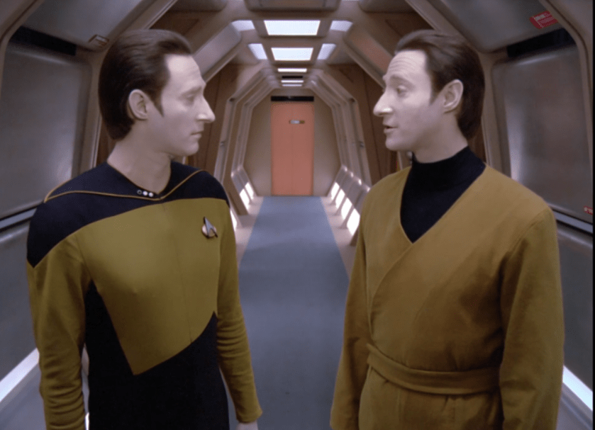 I feel this episode allowed Brent Spiner a lot of leeway as in how he could act. We have Data, who is emotionally disconnected (I still hold the belief he can hold some emotion), Lore who is emotionally unstable and prone to anger and Soong whose dying and has his two mechanical sons* to deal with. Technically I imagine was difficult to film since the actor had to basically act with nothing and then switch parts. They would have had to do some editing later to meld the scenes together. I think that’s why a lot of scenes have the three sitting apart enough from each other they won’t be in the same scene. They could use a stunt double for the back of heads, or arms, but there were a few scenes where the characters interacted on screen.
